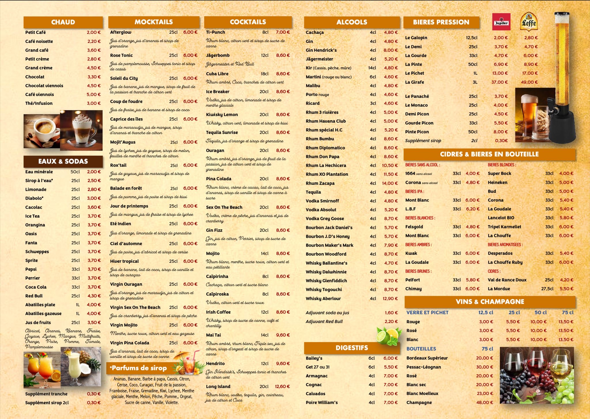 Le service snack et brasserie est ouvert du mardi au samedi de 19h à 1h30 et le dimanche de 19h à 23h00. Sur place ou à emporter.